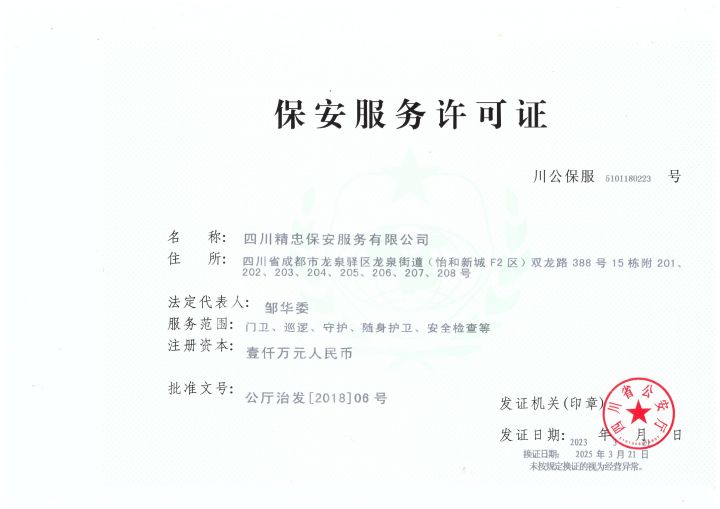 四川精忠保安服務(wù)有限公司是一家專業(yè)化的民營保安服務(wù)公司,于2019年1月在成都市龍泉驛區(qū)市場監(jiān)督管理局注冊登記成立, 注冊實(shí)繳資金1000萬元。主要經(jīng)營:門衛(wèi)、巡邏、守護(hù)、隨身護(hù)衛(wèi)、安全檢查、安全技術(shù)防范、安全風(fēng)險(xiǎn)評估、物業(yè)管理、勞務(wù)派遣、清潔、 禮儀等多項(xiàng)服務(wù)內(nèi)容。